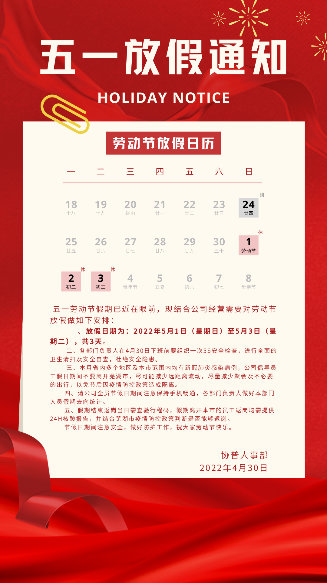 同時,也希望大家在享受“五一”假期的同時,做好個人防護(hù),注意自身安全,過一個平安的勞動節(jié)!
