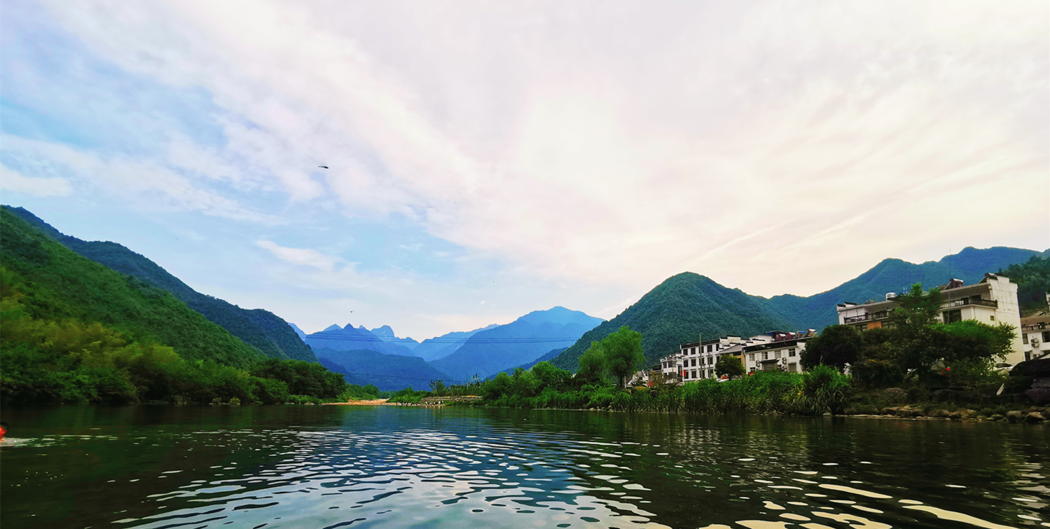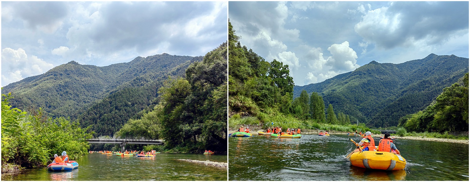 此次行程兩天一夜,在導(dǎo)游的帶領(lǐng)之下,我們首先來到石臺縣大演鄉(xiāng)剡溪村的西黃山漂流景區(qū)。下榻之時,正值正午時分,景點兩岸青山疊嶂、風(fēng)光旖旎、草木蔥蘢、景色怡人。協(xié)普家人們換好服裝,穿上救生衣,在工作人員的協(xié)助之下,或一家?guī)卓?、或三五好友結(jié)伴乘筏而行、泛舟漂流,水面波光瀲滟、河底各式各樣的鵝卵石靜靜地躺著,日復(fù)一日被溪水沖刷,變得光滑又圓潤,坐在游筏里俯身去看,“瞧,有不少小魚正悠閑地在它的身上游過呢”,其水之清澈由此可見一斑。此次漂流全程3公里,在漂流過程中,除了欣賞到秀美的湖光山色,體驗到劈波斬浪的沖刺暢快感,更讓人愜意的是,在河灘淺水區(qū)域漂流回緩,協(xié)普家人們正帶著孩子們,在這悠閑的時光里愉快的打起了水仗,孩子們帶上了自己心愛的水槍玩起了水槍大戰(zhàn),有人帶來了水盆和水瓢,于是乎水槍大戰(zhàn)現(xiàn)場演變成了潑水節(jié),歡笑聲、尖叫聲蕩漾在山谷之間,在這愜意的時光里,平日的壓力和煩擾仿佛已煙消云散。