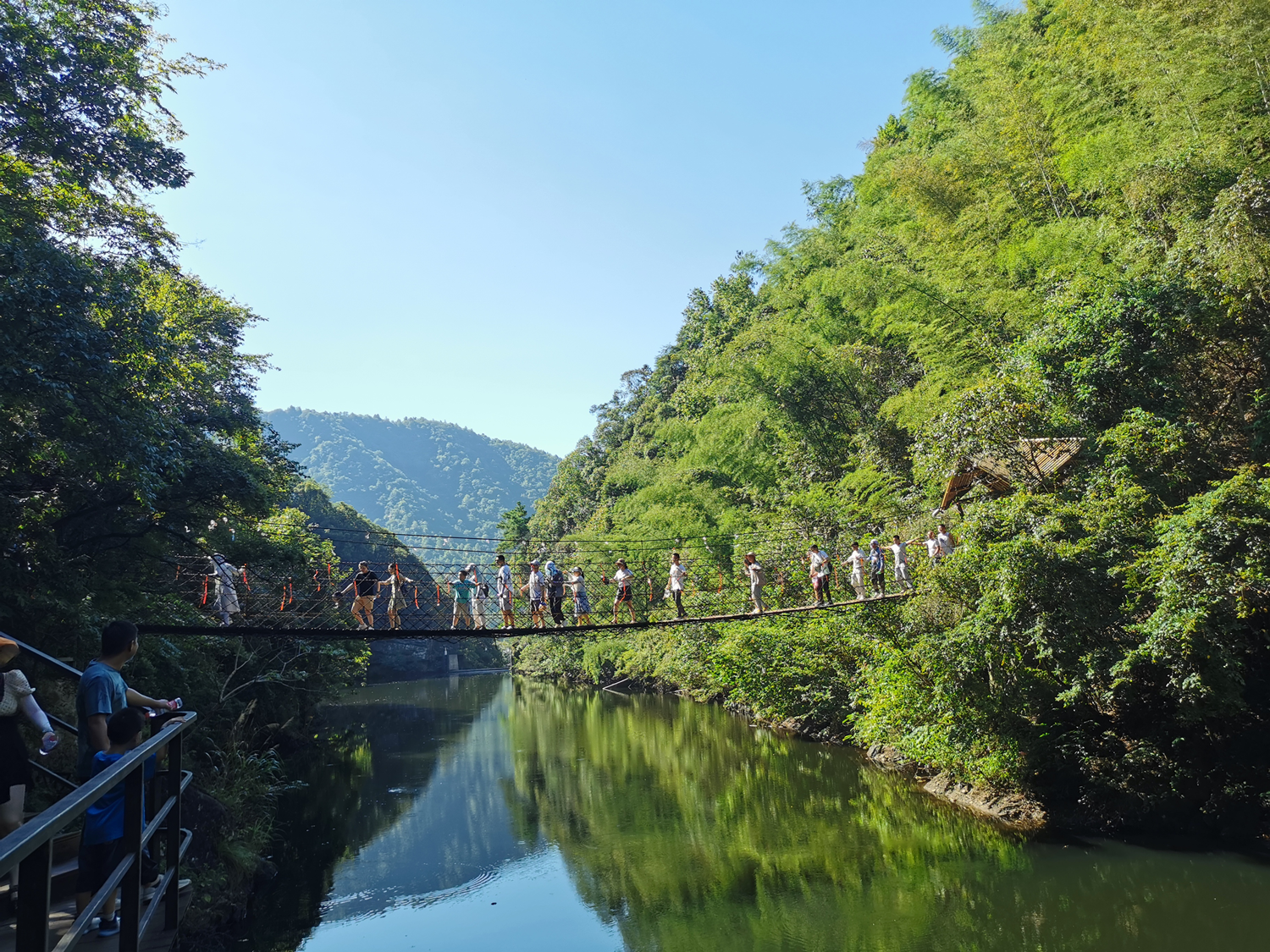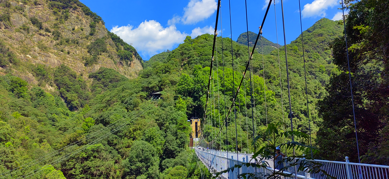 晚上體驗了農(nóng)家樂菜肴和當(dāng)?shù)靥厣袼藓螅诙煸缭绲钠鸫?,吃完早餐集合,大家興致勃勃地乘著大巴來到了醉山野景區(qū),這里是安徽省內(nèi)第一個5D玻璃橋皖南地區(qū)最大的瀑布群。在進(jìn)入景區(qū)之前,有一段鄉(xiāng)村道路,徒步的過程頂著早上八九點的太陽就覺得酷暑難耐,然而當(dāng)我們正式踏入景點,走在山谷間的步棧道上,遠(yuǎn)處是蔥郁的山林、近處是流動的溪水、頂上是一片陰涼,只聽見大朋友們小朋友們都在說“好涼快啊,好涼快??!”沿著步棧道繼續(xù)前行,來到了千花橋,這里是著名的網(wǎng)紅打卡點,小朋友們都絡(luò)繹不絕的脫下鞋子、挽起褲腳,下水嬉戲游玩。有合影拍照的、有撿起小石片仍水花的、還有在石頭縫里抓螃蟹的。大家坐在陰涼的石頭塊上休憩閑聊,甚至玩笑起來,富硒山水、天然氧吧,以后老了退隱山林一定要來這里休養(yǎng)生息。有人不被沿途風(fēng)景耽誤過久,繼續(xù)往山上攀爬,他們到了山頂穿過了玻璃棧橋,體驗了“一覽眾山小”的視野和格局。由于兩個月沒有下雨,雖有山谷溪流卻看不到震撼的黃崖瀑布群,實屬遺憾,卻也給大家下次再來此一游留下了機(jī)會。