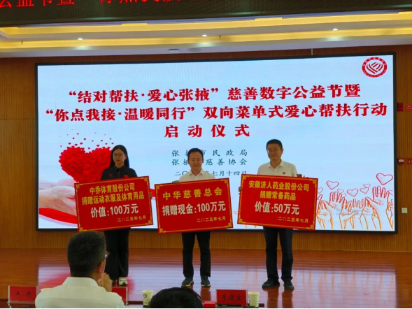 活動儀式上,中華慈善總會向張掖市慈善協(xié)會捐贈現金100萬元,中喬體育股份公司捐贈價值100萬元的運動服和體育用品,安徽濟人藥業(yè)股份公司捐贈價值50萬元的常備藥品。