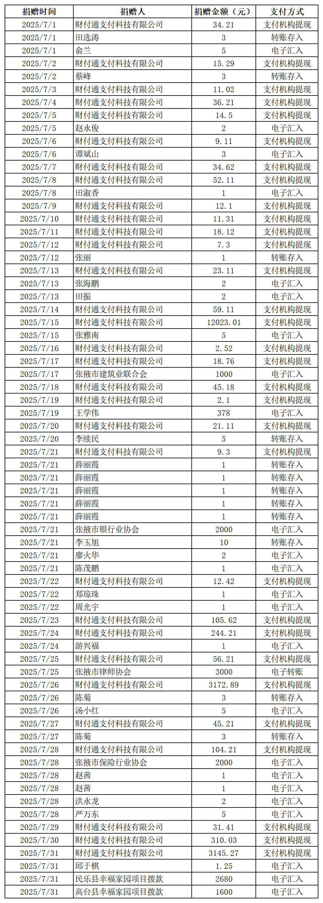 2025年張掖市慈善協(xié)會(huì)積極搭建愛心平臺(tái),得到廣大愛心人士和愛心單位積極響應(yīng),踴躍捐款捐物,現(xiàn)將(2025年7月1日--7月31日)接收到的銀行轉(zhuǎn)賬收入公示如下: